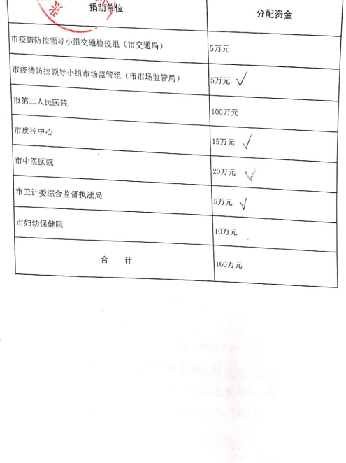 2月7接到市疫情防控領導小組辦公室捐款分配通知,對前期捐贈的183萬元資金分配至以下13個單位: