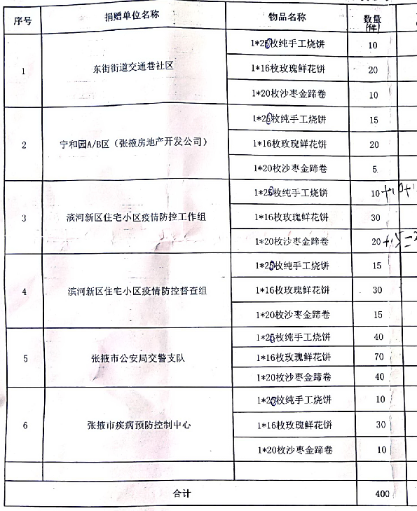 3、甘州名吃定向慰問400箱手工燒餅價值2.51萬元,捐贈人現(xiàn)場慰問完畢。