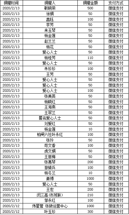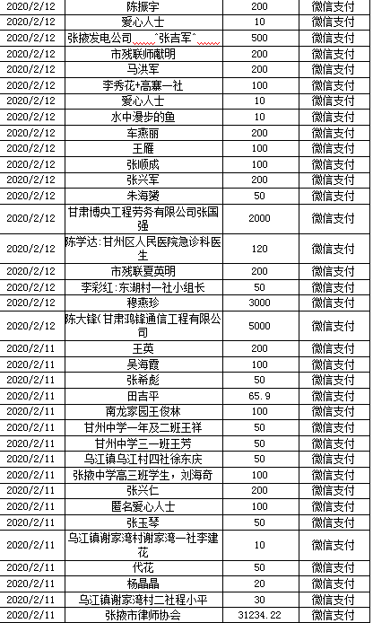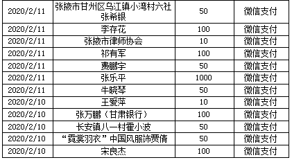 自2020年1月30日張掖市慈善協(xié)會(huì)向社會(huì)發(fā)出《張掖市慈善協(xié)會(huì)抗擊新型冠狀病毒感染的肺炎疫情募捐活動(dòng)倡議書》以來,得到愛心單位和愛心人士積極響應(yīng),踴躍捐款捐物,現(xiàn)將(2月10日下午18時(shí)--2月13日下午18時(shí))接收的款物共計(jì)57.17萬元公示如下: