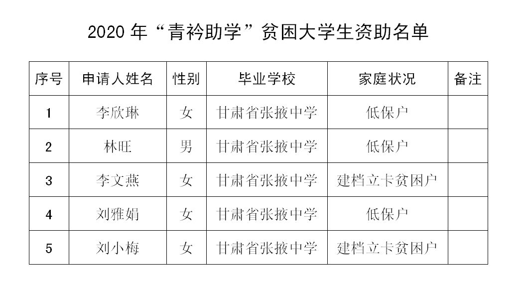 根據(jù)《張掖市慈善協(xié)會、甘肅省張掖中學(xué)、張掖市多成農(nóng)業(yè)有限公司關(guān)于開展2020年“青衿助學(xué)”的公告》,由張掖市多成農(nóng)業(yè)有限公司定向資助開展“青衿助學(xué)”活動。經(jīng)學(xué)生個人申請、“青衿助學(xué)”項目委員會審查、張掖中學(xué)審核入戶、市居民家庭經(jīng)濟(jì)狀況核對中心核對等程序,擬對李欣琳等符合條件的5名貧困大學(xué)生進(jìn)行資助,每人資助5000元?,F(xiàn)將資助學(xué)生名單公示如下(見附表),公示期為2020年8月19日至8月21日,共3天。如需反映有關(guān)情況或意見,由市慈善協(xié)會統(tǒng)一受理。