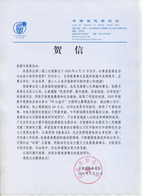 甘肅省慈善總會賀信